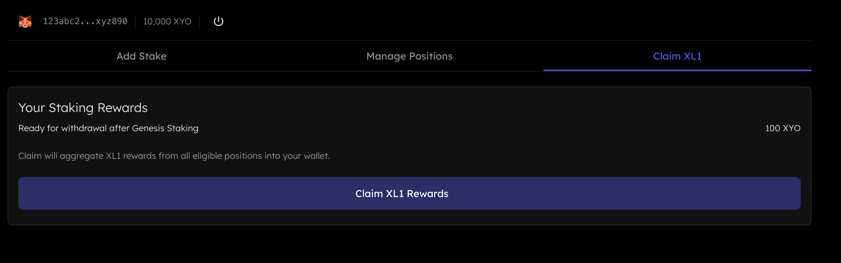 Input the amount of XYO you’d like to stake. Rewards come from the [Step Reward Pool](https://docs.xyo.network/xyo-layer-one/architecture/rewards/step-rewards).